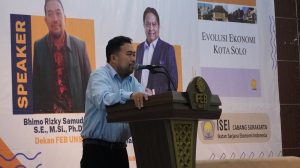 Two faculty members from the Faculty of Economics and Business (FEB), Universitas Sebelas Maret (UNS), Lukman Hakim, S.E., M.Si., Ph.D., and Bhimo Rizky Samudro, S.E., M.Si., Ph.D., served as invited speakers in the Book Talk entitled ‘Evolusi Ekonomi Kota Solo (The Evolution of Solo’s Economy)’ on Wednesday, 11 December 2024. The event took place at the Suhardi Hall of FEB UNS and was organized by the Regional Office of the Indonesian Economic Scholars Association (ISEI) in Surakarta. More than 100 participants attended the session, including members of GenBI (Generasi Baru Indonesia), a student organization of Bank Indonesia scholarship recipients committed to becoming role models, agents of change, and frontliners in disseminating information from Bank Indonesia to the public.