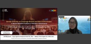 Presenting an article entitled “Gender Diversity on Corporate Boards and ESG Controversies: A Sector-Sensitive Analysis of Women in Governance,” she highlights the relationship between gender diversity on corporate boards and Environmental, Social, and Governance (ESG) controversies in Indonesia. Drawing upon the Upper Echelons Theory and Resource-Based View (RBV), the research examined four sensitive sectors: energy (PT Pertamina), mining (PT Adaro Energy), agribusiness (PT Astra Agro Lestari), and banking (Bank Rakyat Indonesia).